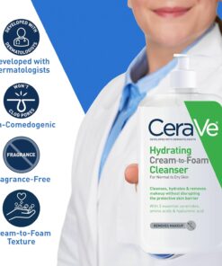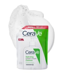 Developed with dermatologists, CeraVe Hydrating Cream-to-Foam Facial Cleanser has a unique one-step cleansing formula with three essential ceramides (1, 3, 6-II) that gently cleanses, thoroughly removes oil and makeup, and hydrates the skin barrier. This gentle face cleanser for dry skin begins as a cream before transforming to a soft foam when you begin to lather it on the skin with water.